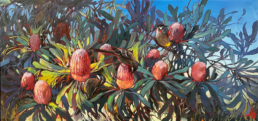 Alix is a local WA artist who creates bold, colourful artworks that reflect her love of beautiful mark marking and dramatic composition, learned in her years as a Graphic Designer and Illustrator. Using Impressionistic style brushwork, she strives to capture the mood using acrylic underpainting and then oil paint in thin washes with some heavy impasto work over the top.